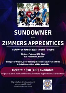 You’re invited to a late afternoon evening of ballads, story – telling and fun songs with The Zimmers Apprentices a six-piece band. Enjoy good music – sit and listen or get up and dance.